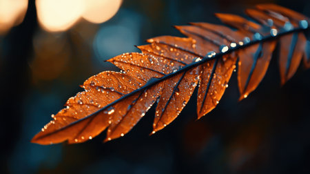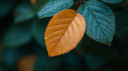 A financial report lies open under the warm glow of sunlight, its stark numbers juxtaposed with the vibrant hues of autumn Two auburn leaves, their edges crisped by the season, rest alongside a single, vibrant green leaf, symbolizing the cyclical nature of business and the convergence of nature and finance AI Generative