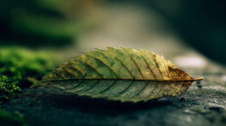 A green leaf rests gracefully on a bed of mossy earth.