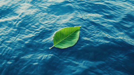 A vibrant green leaf gracefully floats on a dark blue water surface, creating a serene and calming visual effect. Ideal for nature-themed projects.