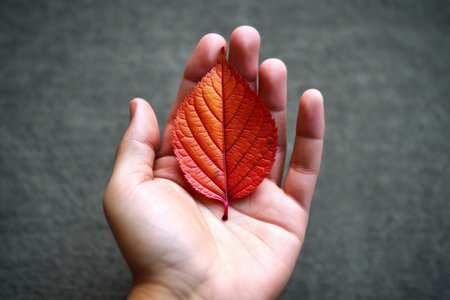 Hand holding a green leaf in the forest. Autumn season concept.