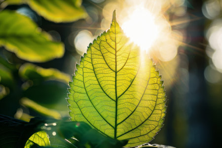 Sunlit Leaf with Visible Veins Against a Blurred Green Background