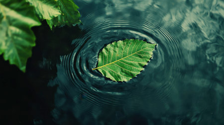 A vibrant green leaf gently floats on a dark water surface, creating a serene atmosphere. The calming ripples enhance the tranquility of nature's beauty.