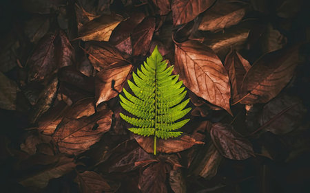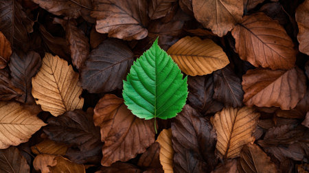 Vibrant green leaf stands out against backdrop of brown, dried leaves, symbolizing renewal and resilience in nature. contrast highlights beauty of life amidst decay