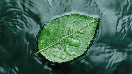 A vibrant green leaf floats gracefully on a serene dark water surface, creating a tranquil atmosphere. The gentle ripples enhance the peaceful composition, perfect for nature themes.
