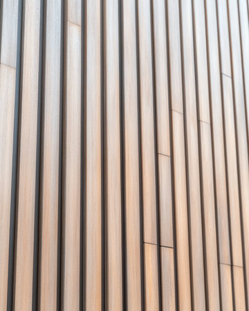 Vertical wooden slats create a modern design on this wall showcasing varying shades and textures that add depth and warmth. The arrangement highlights craftsmanship and elegance.