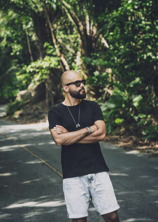 Portrait of a fashion young man at beautiful background in jungle