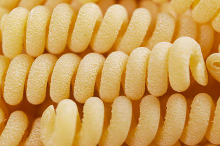 Macro shot of Yellow fusilli pasta background texture. Delicious pasta or fusilli noodles. Italian raw noodles. Homemade dry noodles. Spaghetti surface