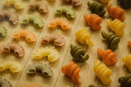 Multicolored macaroni of unusual shape with natural vegetable dyes, lined in circle. Background closeup.