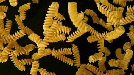 Falling fusilli pasta. Flying yellow raw macaroni over black background. Shallow dof.