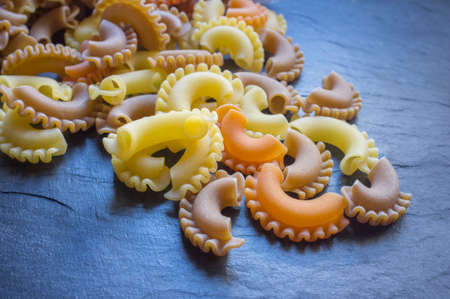 Three colors Creste di galli pasta over black slate board. closeup shotselective focus