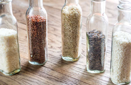 Assortment of Various grains rice in bowls.