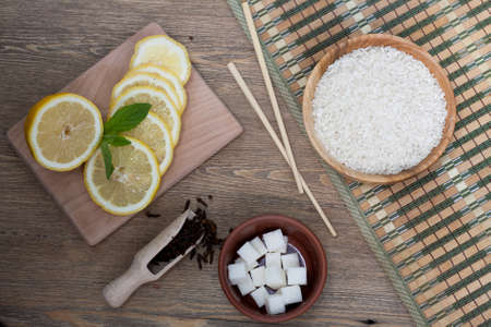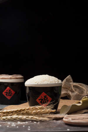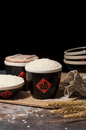 Black ceramics and rice to make sake. Japanese cuisine.