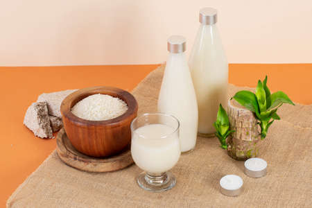 Jar of rice water for skin care face cleansing cosmetic product. Holistic beauty concept, fermented beauty care trend
