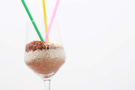 Rice in glass and tube on white background