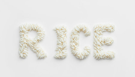 Raw rice arranged in the word RICE on a plain white isolate background. AI Generated.