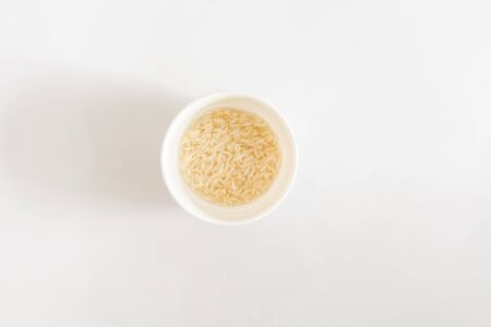 A long grain white rice, on rattan handmade bowl isolated on white background. Copy space