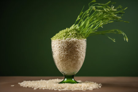 Rice in a glass on a wooden table and green background.