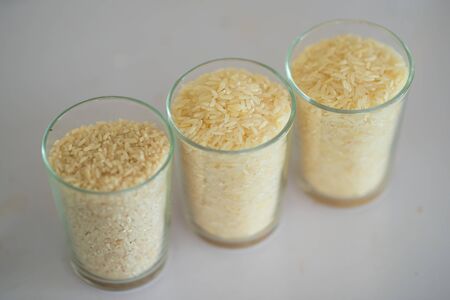 Rice in a glass mug on a white background. Side view