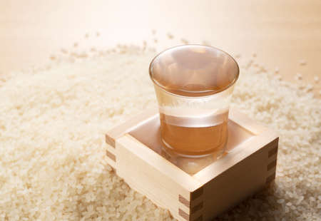 Cold sake with rice and ear of rice on the table