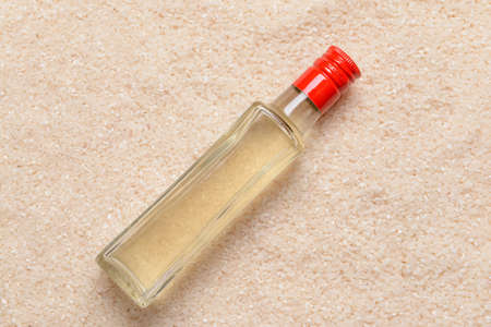 Bottle of rice vinegar on rice background