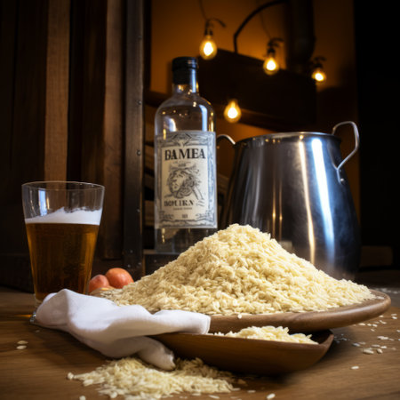 Sake and Japanese Rice A close-up of a traditional Japanese sake flask and cup with white rice and golden rice stalks in the background. This image highlights the connection betwe