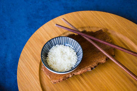 Asian tableware, raw rice, bowl and chopsticks, wooden material, ceramic bowl. Seeds of rice.