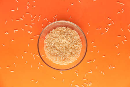 White rice on a red background. Top view. Copy space.