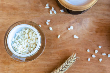 Wheat and barley natural cosmetic. Cosmetic jar and wheat ears on wooden background.