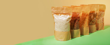 Paper bags with cellophane with cereals standing in diagonal on beige-green backdrop. Zero Waste Food Storage Concept. No plastic. Stock for a rainy day. Stock for quarantine. Banner, copy space.