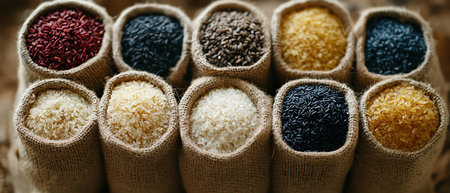 Overhead view of burlap sacks filled with various types of rice in different colors and textures