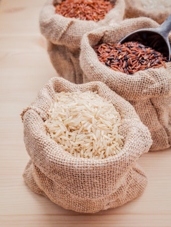 Mixed whole grain traditional thai rices best rices for healthy and super food in hemp sacks bag setup on wooden background.