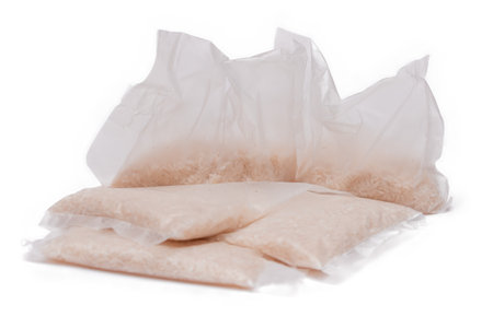 A Plastic Bags of White Long Grain Rice - Isolated on White Background. Small Transparent Packages with Dry Rice - Isolation