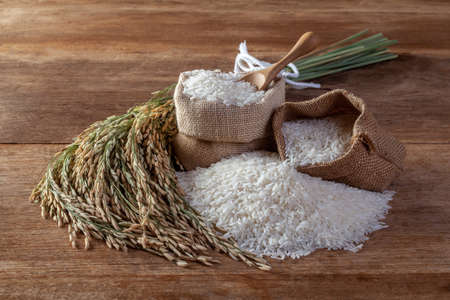 Jasmine rice in sack and paddy rice on old wooden table background with copy space