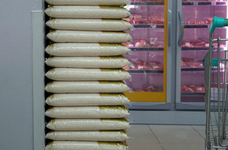 Rice Packed in Plastic Bags and on a Shelf Ready for Sale