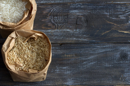 Raw long-grain brown and white basmati rice in a paper craft bags on a wooden background, space