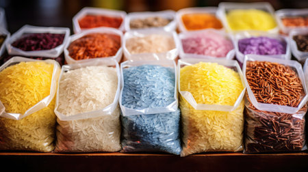 Rice in bags on the black stone board. lit studio lights.