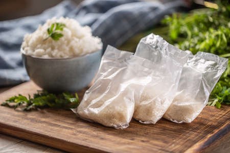 Raw rice in plastic bags on wooden background and cooked rice in bowl.