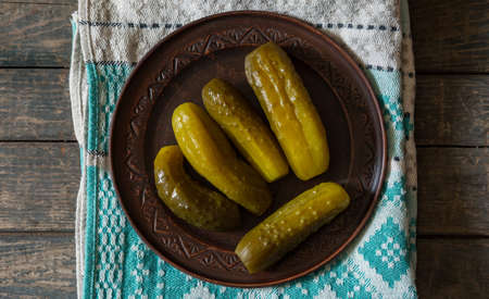 Salted pickled cucumbers in a brown plate on a towel on a wooden texture