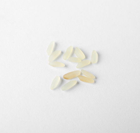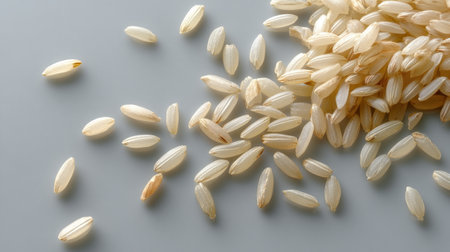 A close-up image of raw white rice grains scattered across a light background, perfect for culinary, food, and nutrition-related projects or concepts.