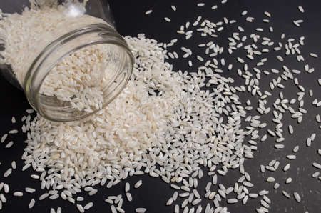 Rice scattered on an isolated black background, transparent glass jar scattering rice on a black background, food ingredient, healthy food.
