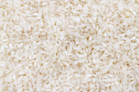 White long rice background, uncooked raw cereals, macro closeup