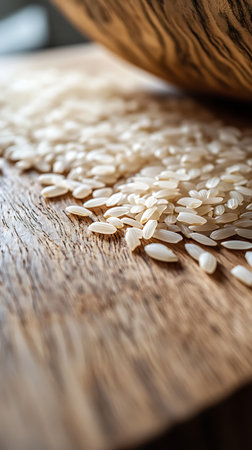 Close-up captures a scattering of uncooked rice on a worn wooden table. Natural light highlights the texture of both grains and wood. Warm, simple food photography.