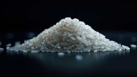 A mound of uncooked white rice is placed on a dark surface, contrasting with the background. Each individual grain reflects light, showcasing texture and forms.