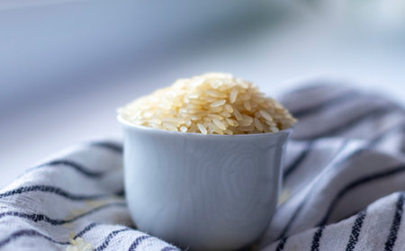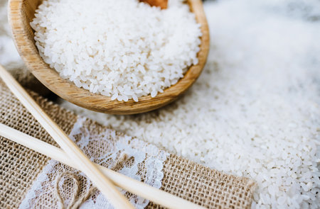 Natural rice closeup. Organic dry food, Asian diet, small grains with rough texture. Healthy nutrition. Selective focus on the details, blurred background.