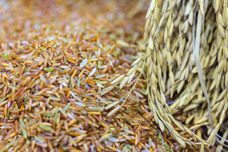 Close-up image of paddy and Raw rice grain. Paddy rice background.