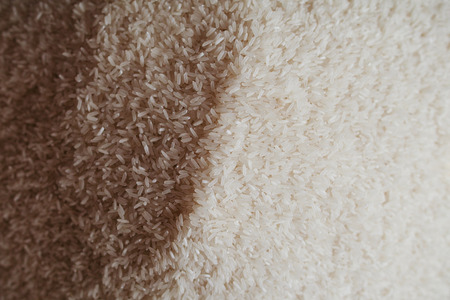 Brown and white rice grains. Food background. Close up