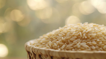 This image showcases a close-up of raw white rice in a woven basket. The soft, blurred background creates a warm atmosphere, highlighting the grain's texture and appeal.