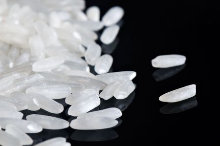 Close-up white grains of rice on black mirrored surface