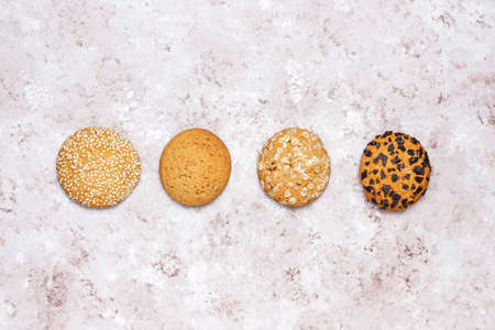 Set of various american style cookies on a light concrete background. Shortbread with confetti, sesame seed, peanut butter, oatmeal and chocolate chip cookies.
