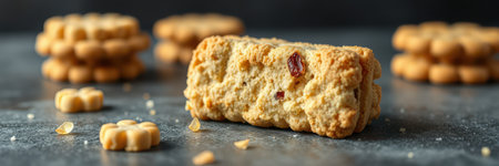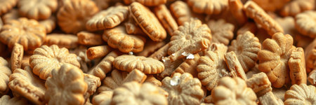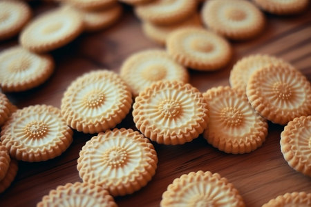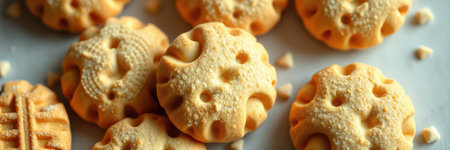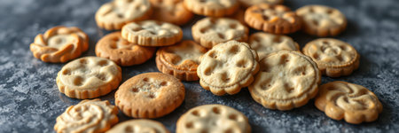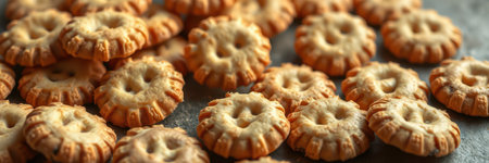 Delicious golden baked cookies arranged on dark background showcasing their unique texture and shape